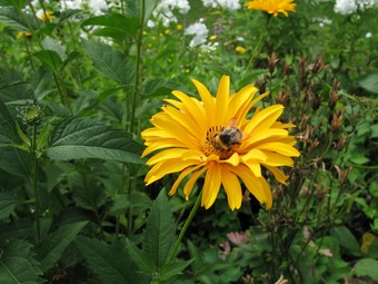 Das Foto gehört zur Serie Blumen im Garten. Es zeigt eine Ringelblume (Calendula). Sie ist einjährig und wächst am besten in Gruppen. Die Ringelblume ist nicht winterhart, wächst aber im Folgejahr durch ihren winterharten Samen von selbst wieder. Calendula officinalis war die Heilpflanze des Jahres 2009. Hier sucht eine Erdhummel nach Nektar. Es gelten die Nutzungsbedingungen der Mediothek und Pixiothek.