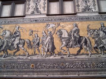 Das Foto gehört zur Serie "Dresdener Fürstenzug". Es zeigt den Abschnitt 1349 bis 1484 - Friedrich der Strenge, Friedrich der Streitbare. Der Fürstenzug in Dresden ist das Bild eines Reiterzuges, aufgetragen auf rund 23.000 Fliesen aus Meißner Porzellan auf der Außenwand des Stallhofs in der Augustusstraße. Das 102 Meter lange Kunstwerk stellt die Ahnengalerie der zwischen 1127 und 1873 in Sachsen herrschenden Markgrafen, Herzöge, Kurfürsten und Könige aus dem Geschlecht des Fürstenhauses Wettin dar. Es gelten die Nutzungsbedingungen der Mediothek und Pixiothek.