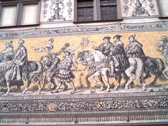 Das Foto gehört zur Serie "Dresdener Fürstenzug". Es zeigt den Abschnitt 1464 bis 1547 - Ernst der Sanftmütige, Albrecht der Beherzte, Friedrich der Weise, Johann der Beständige. Der Fürstenzug in Dresden ist das Bild eines Reiterzuges, aufgetragen auf rund 23.000 Fliesen aus Meißner Porzellan auf der Außenwand des Stallhofs in der Augustusstraße. Das 102 Meter lange Kunstwerk stellt die Ahnengalerie der zwischen 1127 und 1873 in Sachsen herrschenden Markgrafen, Herzöge, Kurfürsten und Könige aus dem Geschlecht des Fürstenhauses Wettin dar. Es gelten die Nutzungsbedingungen der Mediothek und Pixiothek.