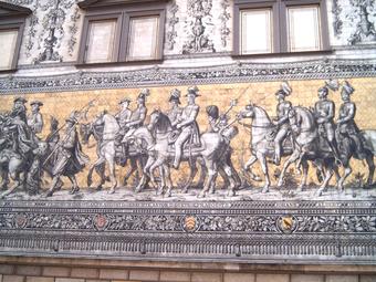 Das Foto gehört zur Serie "Dresdener Fürstenzug". Es zeigt den Abschnitt 1733 bis 1873 - Friedrich Christian, Friedrich August der Gerechte, Anton der Gütige, Friedrich August II., Johann, Albert, Georg. Der Fürstenzug in Dresden ist das Bild eines Reiterzuges, aufgetragen auf rund 23.000 Fliesen aus Meißner Porzellan auf der Außenwand des Stallhofs in der Augustusstraße. Das 102 Meter lange Kunstwerk stellt die Ahnengalerie der zwischen 1127 und 1873 in Sachsen herrschenden Markgrafen, Herzöge, Kurfürsten und Könige aus dem Geschlecht des Fürstenhauses Wettin dar. Es gelten die Nutzungsbedingungen der Mediothek und Pixiothek.