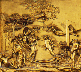Das Foto gehört zur Serie "Paradiestür am Baptisterium von Florenz". Es zeigt Adam und Eva, ein Bronzerelief von Lorenzo Ghiberti. Es ist als die obere linke von zehn Bildtafeln in seine Paradiestür (auch Paradiespforte genannt) eingebunden. Es gelten die Nutzungsbedingungen der Mediothek und Pixiothek.