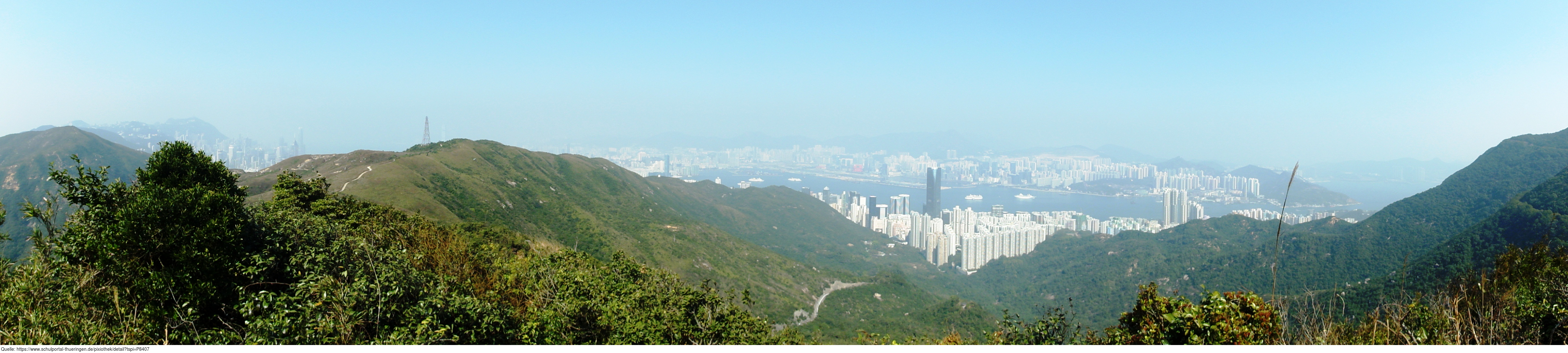 Das Foto gehört zur Serie "Hong Kong Trail". Es zeigt ein Panoramabild von Hong Kong und den umliegenden Bergen. Es gelten die Nutzungsbedingungen der Mediothek und Pixiothek.