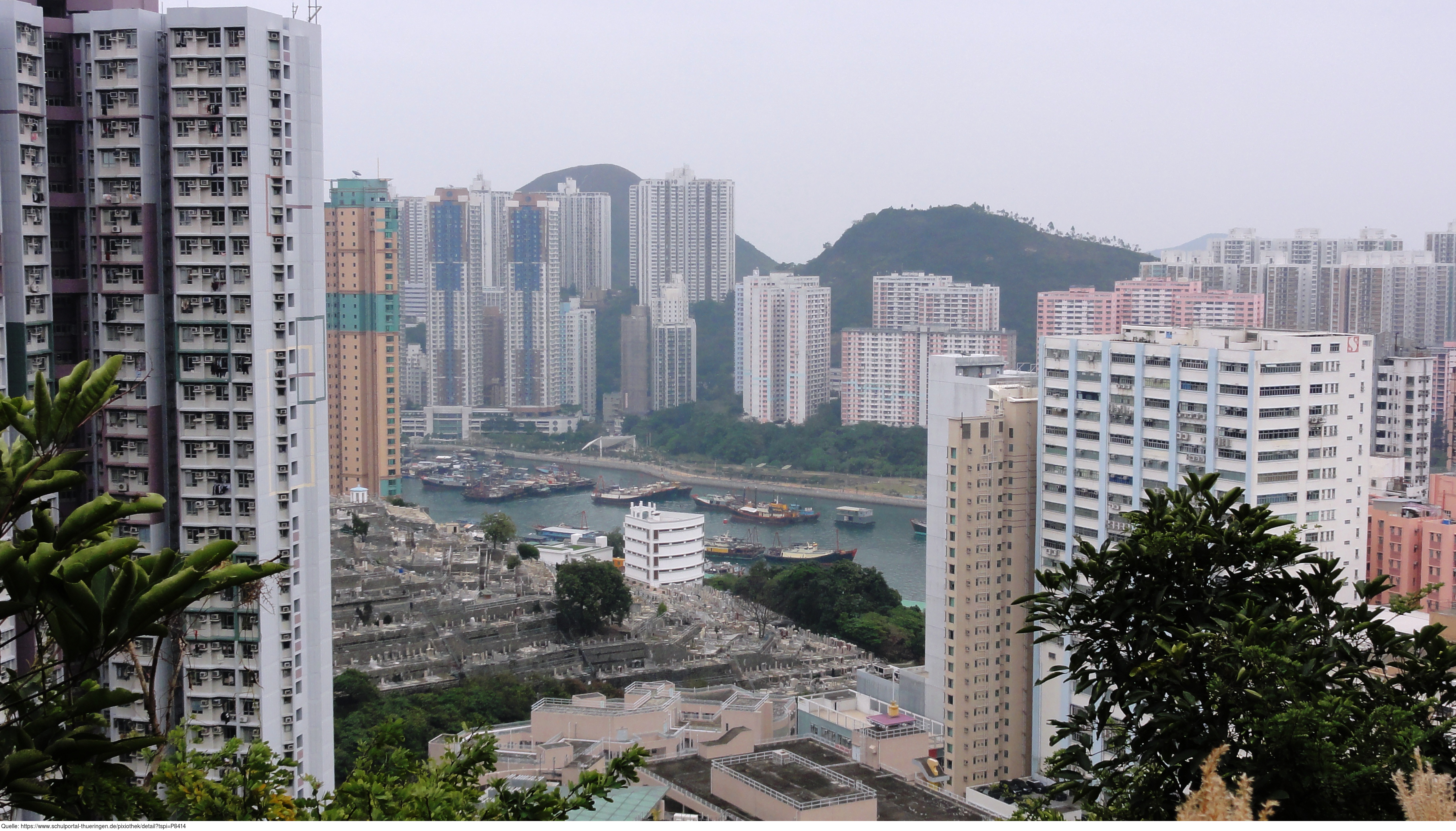 Das Foto gehört zur Serie "Hong Kong Trail". Es zeigt Aberdeen Harbour. ein typisches Bild für Hong Kong, der Mix aus Hafen, Friedhof und Wohnhäusern auf engstem Raum. Es gelten die Nutzungsbedingungen der Mediothek und Pixiothek.