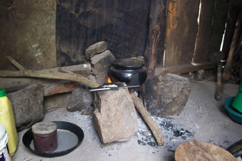 Das Bild zeigt die Kochstelle in einem Gebäude einer ländlichen Siedlung in Tansania. Es gelten die Nutzungsbedingungen der Mediothek und Pixiothek.