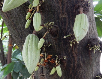 Das Foto gehört zur Serie "Kakao". Es zeigt geschlossene, geöffnete und verwelkte Blüten sowie sich entwickelnde Früchte am Stamm eines Kakaobaums. Das Bild ist unter CC0 lizenziert und kann somit frei verwendet werden.