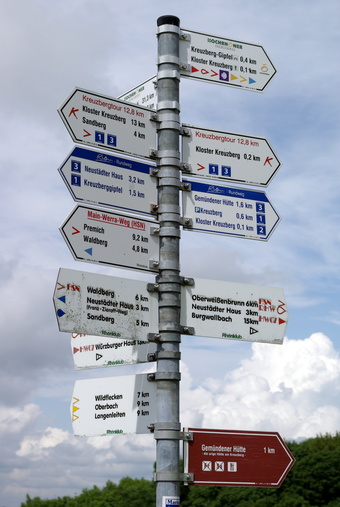Das Bild gehört zur Serie "Rhön". Es zeigt einen Wegweiser für Wanderer in der Nähe vom Kloster Kreuzberg. Das Kloster liegt nahe der Stadt Bischofsheim an der Rhön. Das Bild ist unter CC0 lizenziert und kann somit frei verwendet werden.