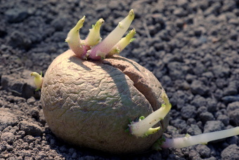 Das Foto gehört zur Serie "Nutzpflanzen". Es zeigt eine Saatkartoffel mit Dunkelkeimen auf dem Feld. Das Bild ist unter CC0 lizenziert und kann somit frei verwendet werden.