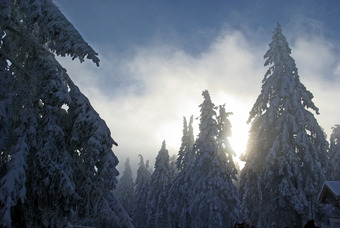 Das Bild gehört zur Serie "Winterlandschaft". Es zeigt verschneite Nadelbäume. Das Bild ist unter CC0 lizenziert und kann somit frei verwendet werden.