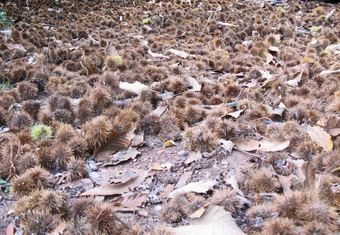 Das Foto gehört zur Serie "Laubbäume". Es zeigt abgeworfene Fruchtbecher der Edelkastanie (Castanea sativa), auch Esskastanie genannt. Die Früchte in den Fruchtbechern sind Maronen bzw. Esskastanien. Das Bild ist unter CC0 lizenziert und kann somit frei verwendet werden.