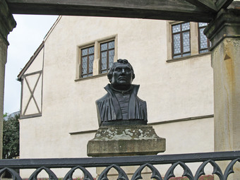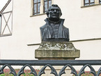 Das Bild zeigt das Denkmal vor dem Geburtshaus von Martin Luther in der Lutherstadt Eisleben.