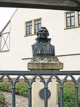 Das Bild zeigt das Denkmal vor dem Geburtshaus von Martin Luther in der Lutherstadt Eisleben.