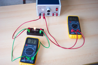 Das Foto gehört zur Serie "Elektrik". Es zeigt die Messung von Stromstärke und Spannung an einer Glühlampe mit digitalen Messgeräten. Das Bild ist unter CC0 lizenziert und kann somit frei verwendet werden.