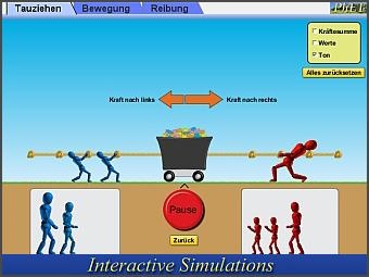 Diese interaktive Simulation veranschaulicht die Bewegung von Körpern, wenn Kräfte auf diesen wirken. Die Simulation besteht aus den Bereichen Tauziehen, Bewegung und Reibung.